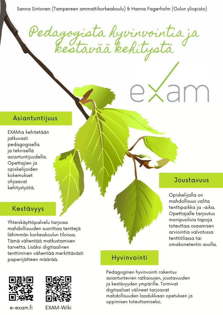 EXAM-korkeakouluille on tärkeää edistää sekä pedagogista hyvinvointia että kestävää kehitystä. EXAM-järjestelmä on viitoittanut korkeakouluille tien digitalisoida osaamisen tunnustamisen ja sitä kautta tukea opiskelijoiden ja opettajien hyvinvointia arjessa. Lisäksi sähköisen järjestelmän käyttöönotto on vähentänyt merkittävästi tenttitilanteissa syntyvän paperijätteen määrää. Pelkästään se, että paperiset tentit kopioidaan sähköiseen muotoon ei riitä takaamaan pedagogisen hyvinvoinnin edistystä, vaan tenttikäytäntöjen kehitystyöhön tarvitaan myös laajempaa arviointikäytäntöjen uudistamista. Tentti on opiskelijalle merkityksellinen tapahtuma, johon usein liittyy paljon valmistautumista ja stressiä. Siksi laadukkaiden ja yhdenvertaisten tenttikäytäntöjen kehitystyö on erityisen tärkeää pedagogisen hyvinvoinnin tukemisessa.