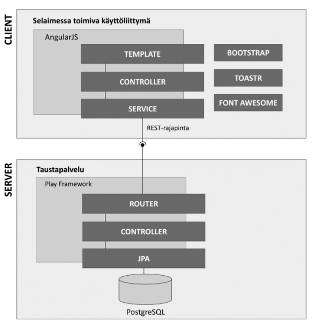 EXAM-tenttipalvelu on toteutettu asiakas–palvelin-arkkitehtuurilla. Palvelimen muodostaa Play framework komponentteineen. Käyttöliittymä on rakennettu käyttäen AngularJS-kirjastoa. Palvelin ja asiakaspään muodostava käyttöliittymä kommunikoivat keskenään REST-rajapinnan kautta.